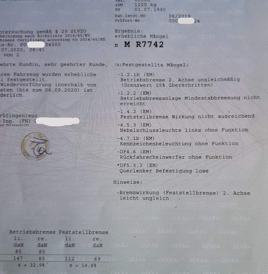 Anfangs gab´s erhebliche Mängel; Rückfahrscheinwerfer, Kennzeichenbeleuchtung, Nebelschlußleuchte, Bremse hinten rechts.