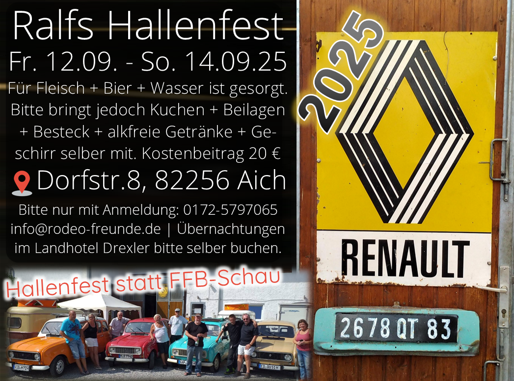Da die Motorworld Oldtimertage Fürstenfeld 2024 wieder nicht stattfand, planten wir unser Hallenfest auch wieder am Wochenende vom Freitag 19. bis 22. September. Am Samstag gab es unter anderem Showschrauben an einem Renault R4, Es wurde mal eben ein Faltdach eingebaut. Hände -> schnelles Ende;-) Für Kaffee und Grillgut war gesorgt.